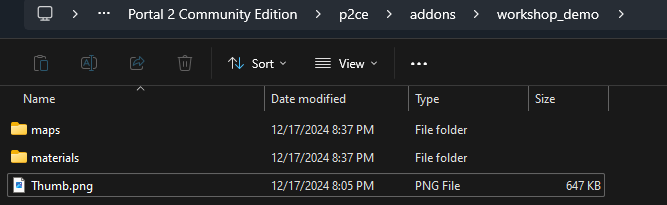 Before uploading your addon, you must make sure all of your addon's assets (maps, materials, scripts, models, etc) are all in the right folders. Your Addon should be structured similar to a custom folder or sourcemod, with the root folder being your MOD folder and the subfolders being where your assets are located. It is usually the best practice to put your addon inside of p2ce\addons, as the game can register your addon as a local addon and you can manage it like any other addon from the workshop inside of the game. Your folder setup should look similar to this: