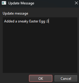 Updating an addon is as simple as uploading it. Add the new files to the addon folder and then reopen your addon in the Uploader. If you get a message saying that addon.kv3 has been changed, accept the popup and move on. Now, make any additional changes to your addon, and click "Upload". You will get a popup asking you for an update message that looks like this: